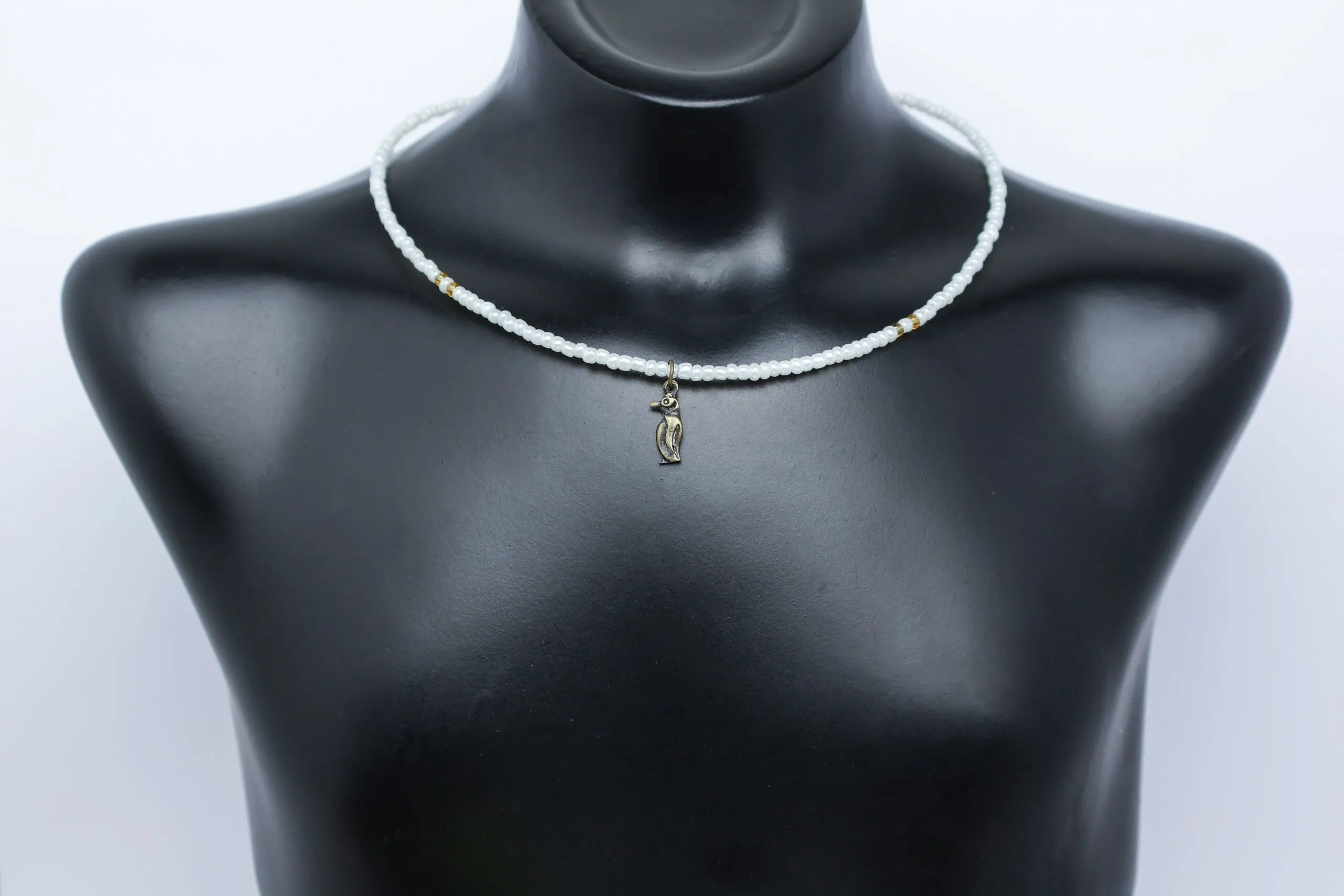 An antique brass penguin charm on a white and gold seed bead necklace