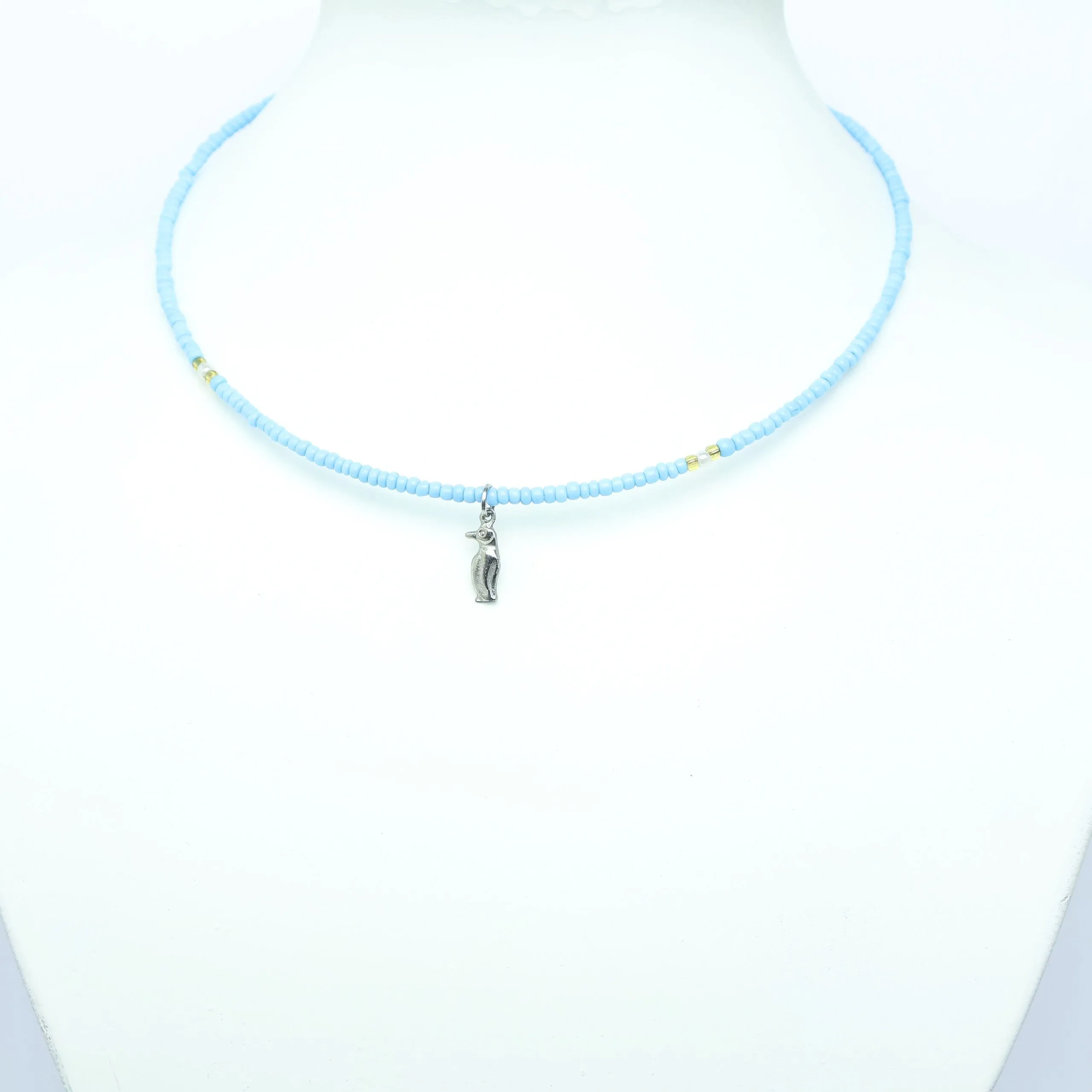 A silver coloured penguin charm on a blue and white seed bead necklace