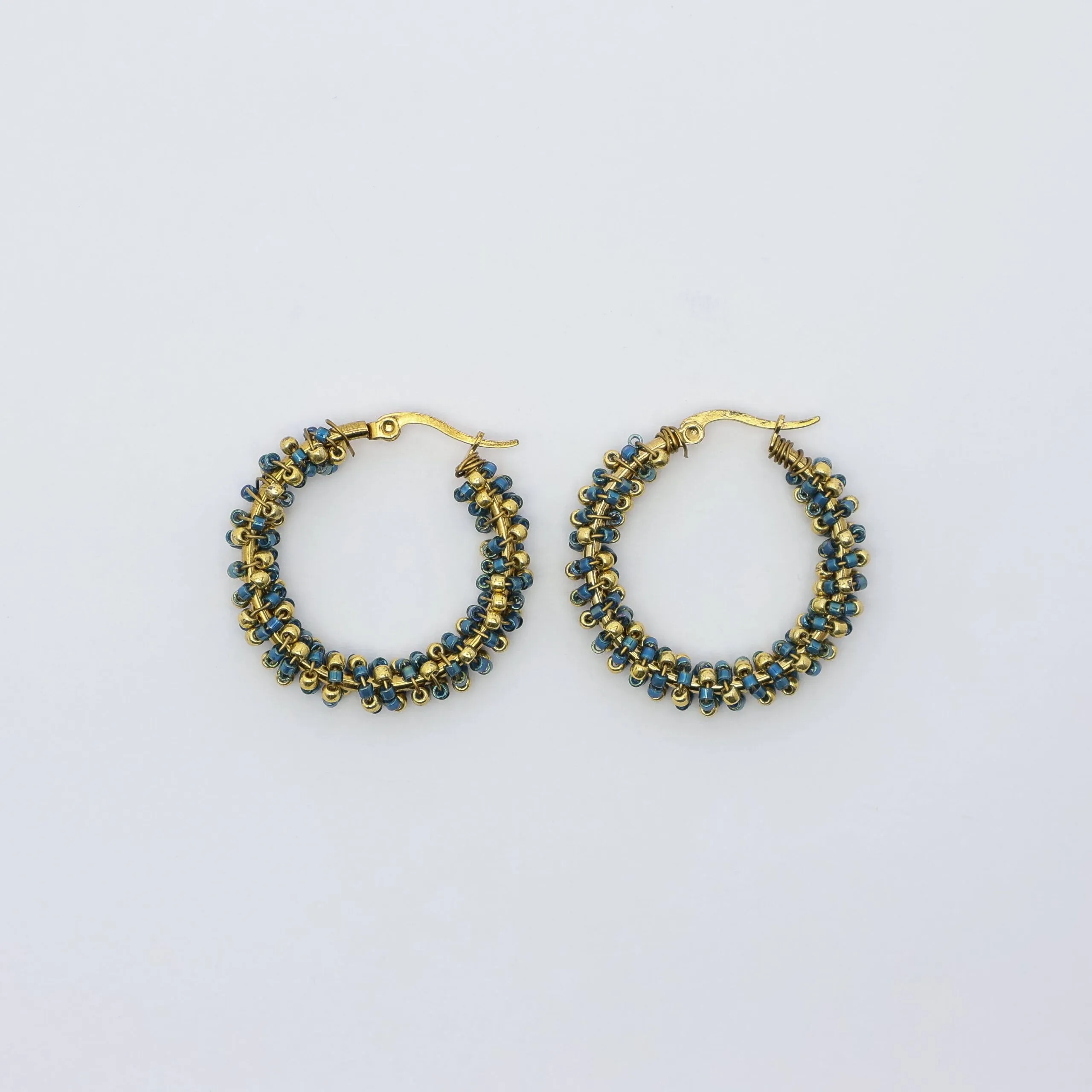 Gold Plated Earring Hoops Wrapped with Gold and Blue Seed Beads