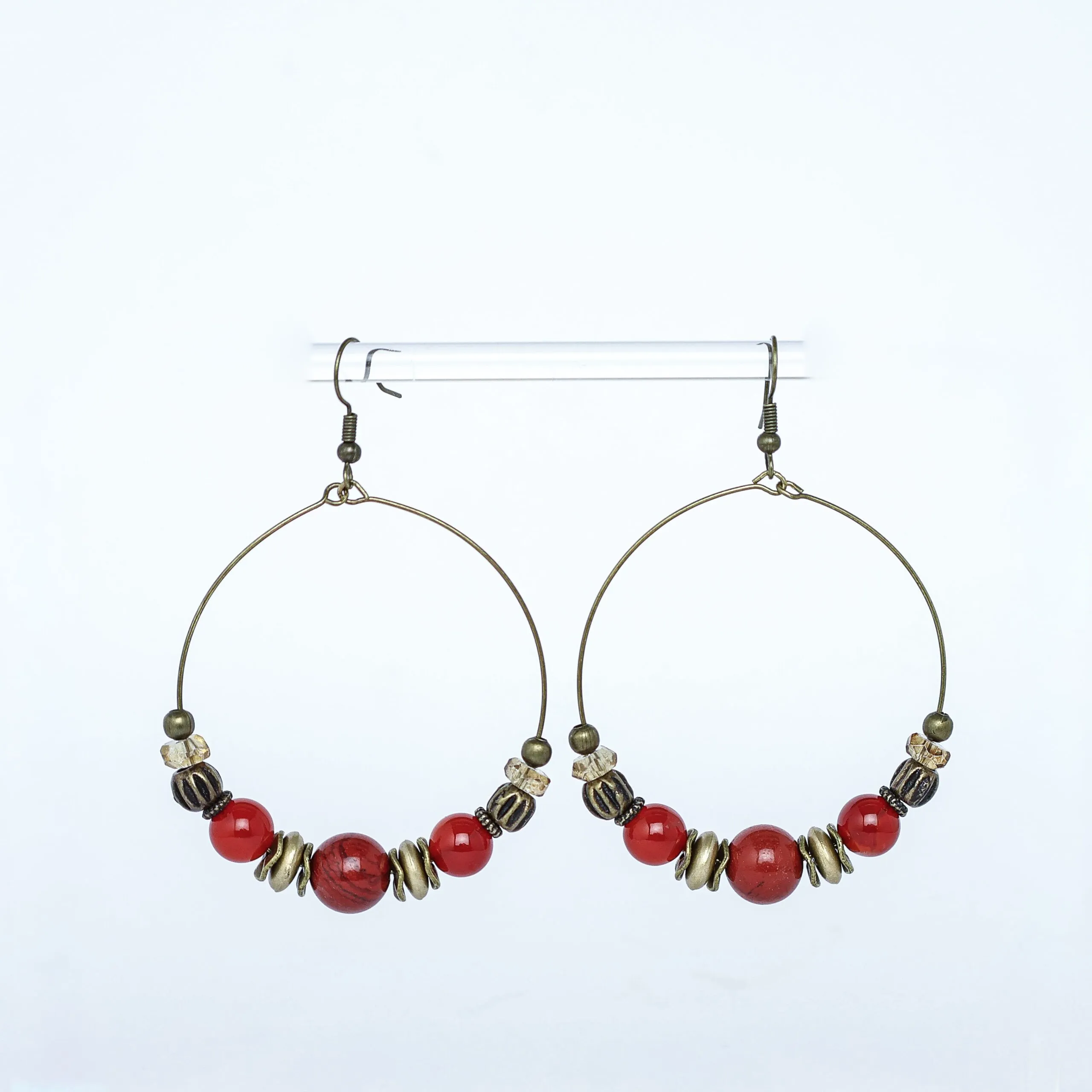 Antique Brass Hoops with Carnelian, Jasper and Wood