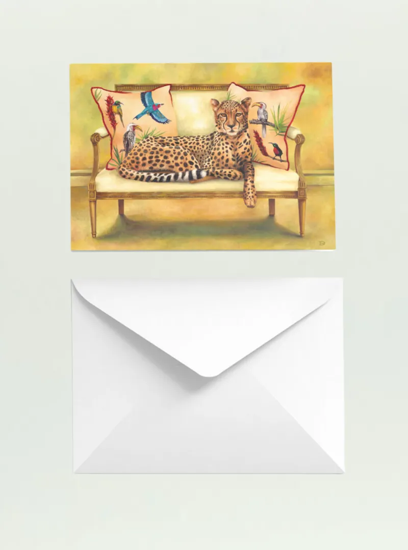 This blank A6 greeting card features the 'Cheetah at Leisure' painting by artist Dezireë Smith. 'Cheetah at Leisure' is part of the 'Wildlife at Leisure' range by Whimsical Collection.