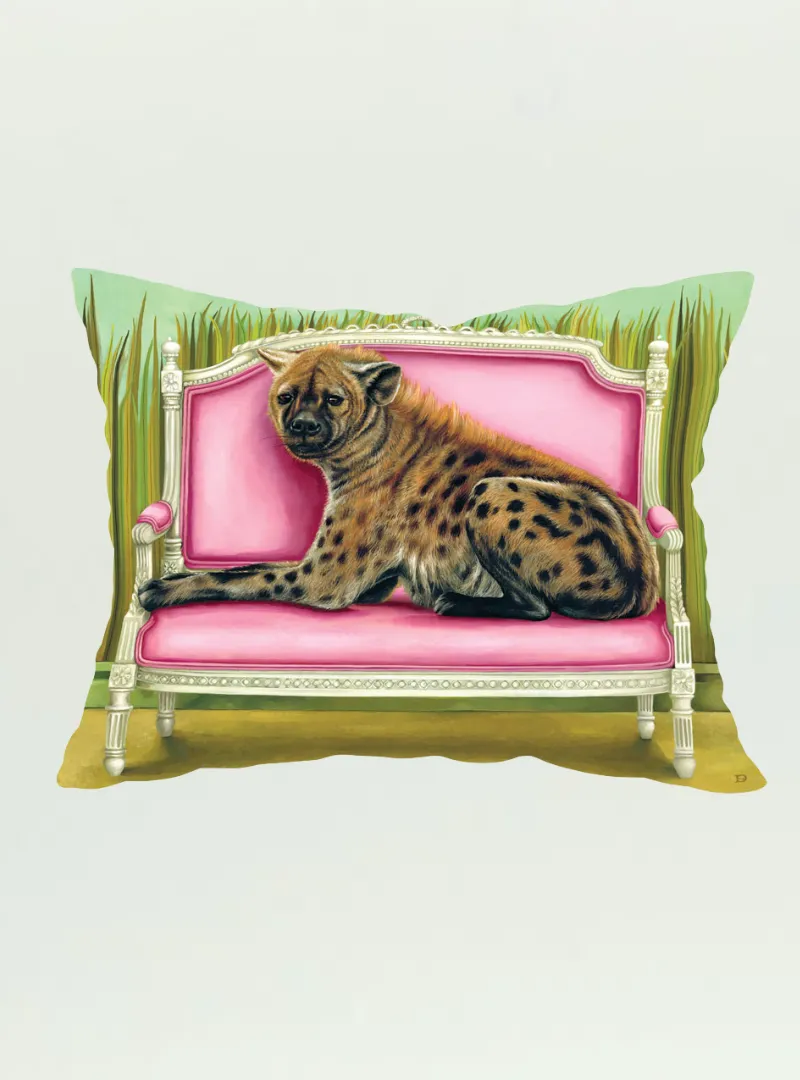 100% Cotton pillow cover. The original 'Spotted Hyena at Leisure' was painted in oils on canvas by South African artist Dezireë Smith.