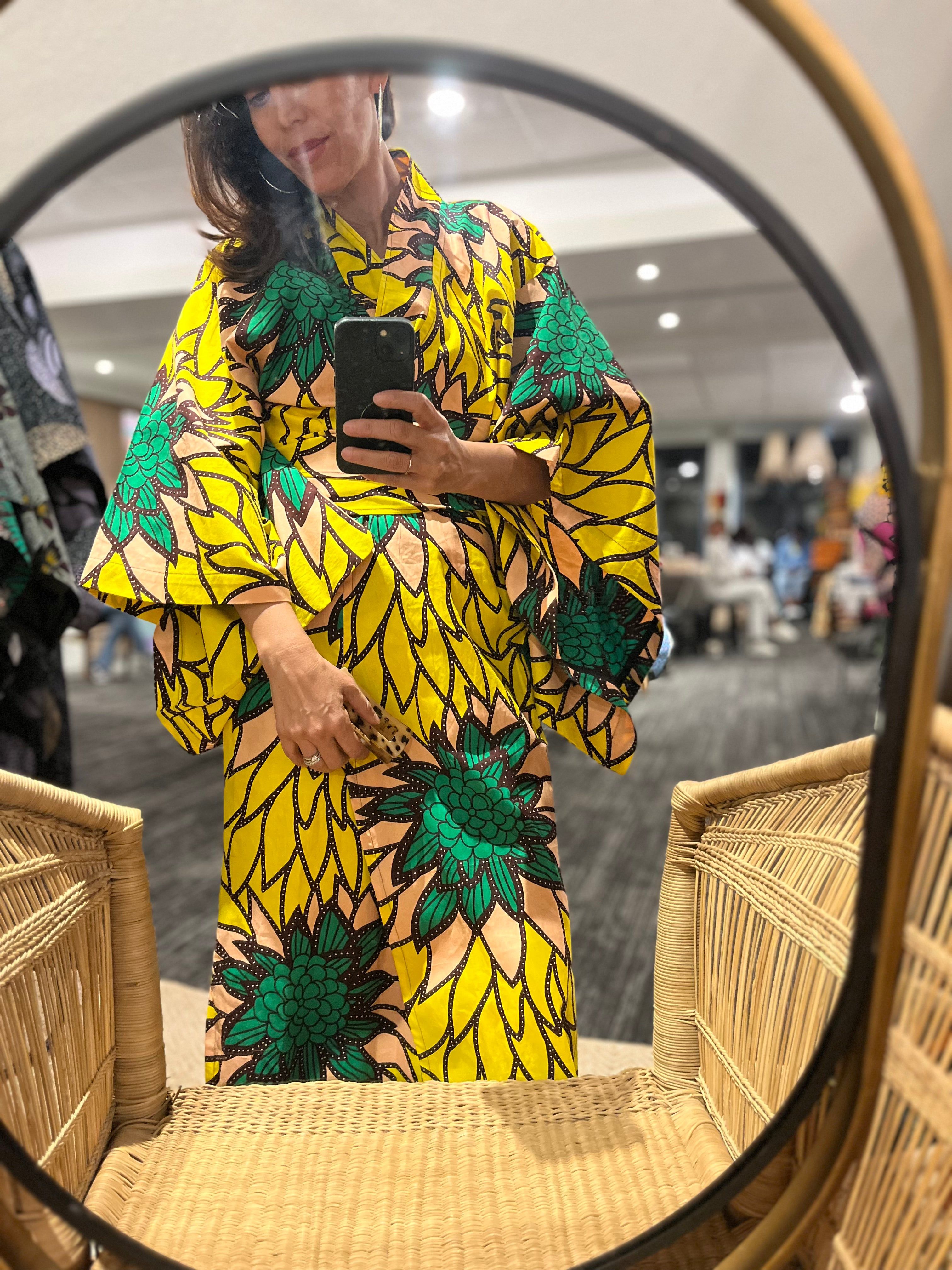 This versatile garment takes inspiration from the elegant lines of the traditional Japanese kimono, reimagined with the vibrancy of African fabrics.