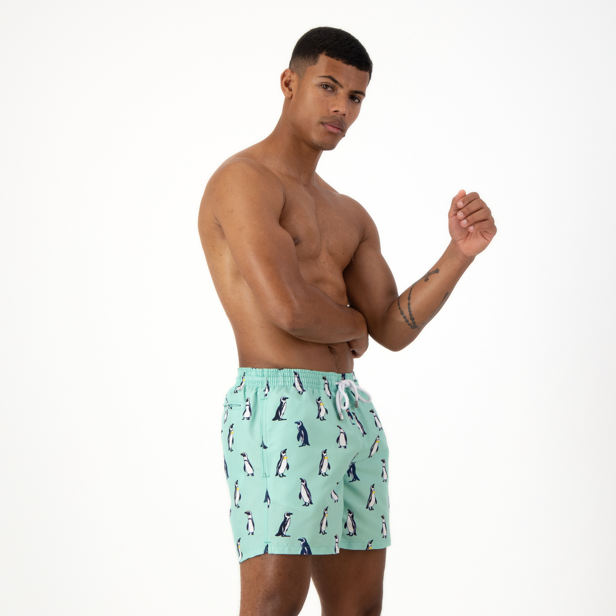 Wrap yourself in playful charm with this beautifully designed towel featuring a dapper Boulders Beach penguin sunbathing on a rock.