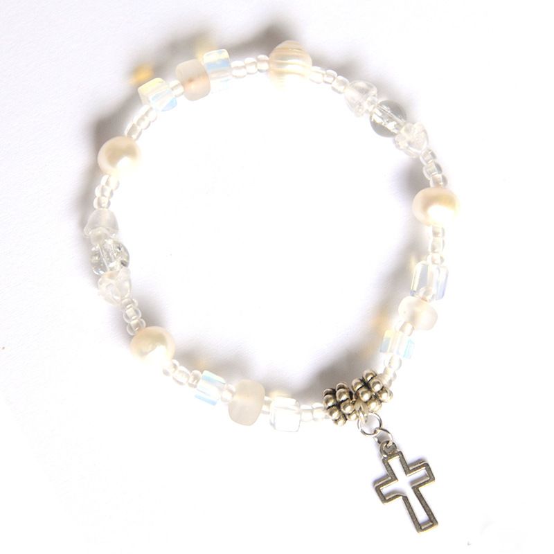 "Life of Jesus" bracelet. Red, purple and copper coloured beads with Christian symbols - BRSF901