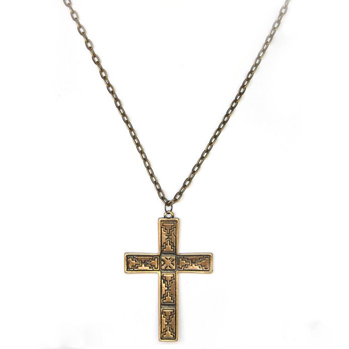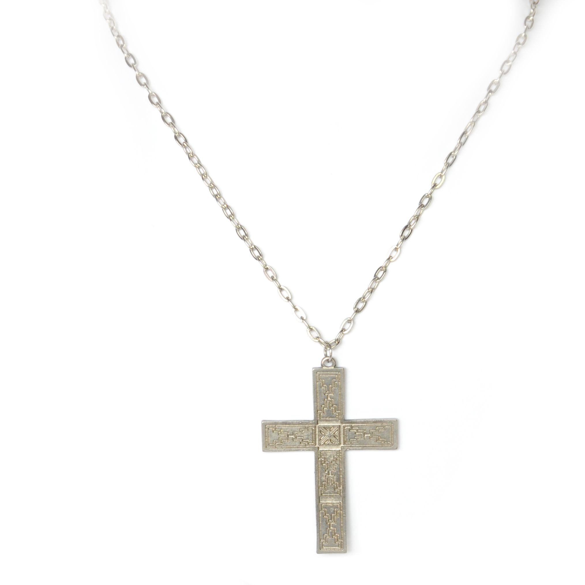 Large antique silver colour cross necklace with ethnic design - NWCES