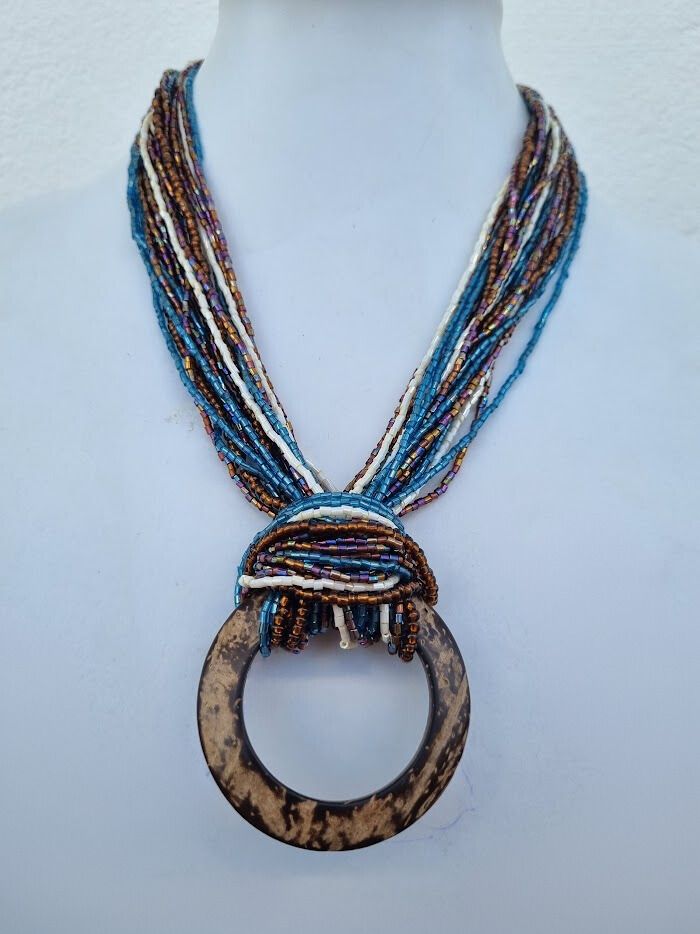A gemstone tumble of aloe shades, on an antique brass chain, with asymmetrical brass features.