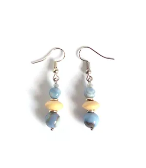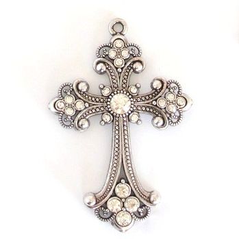 “love” necklace with small cut-out cross and freshwater pearl and facetted glass drop.