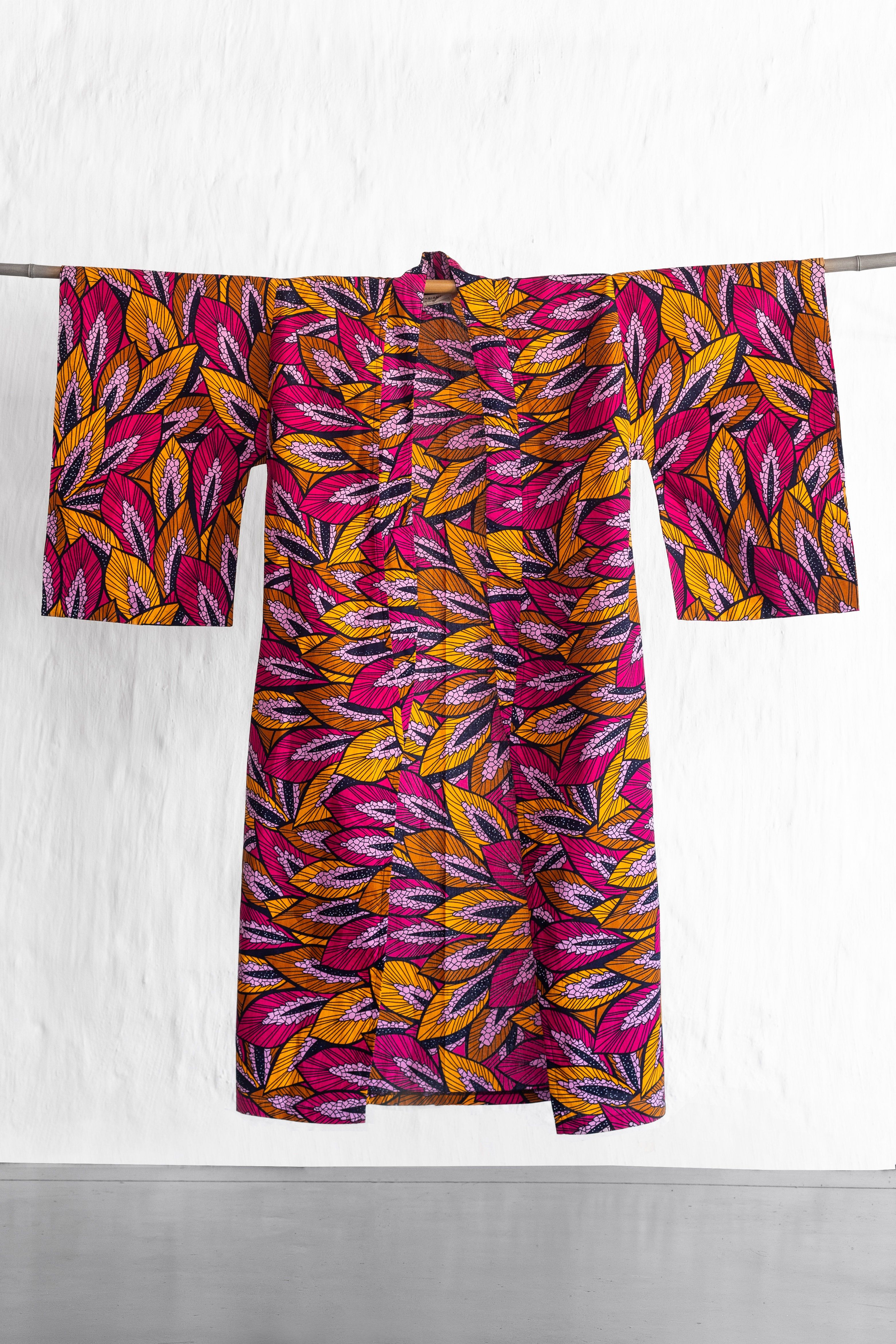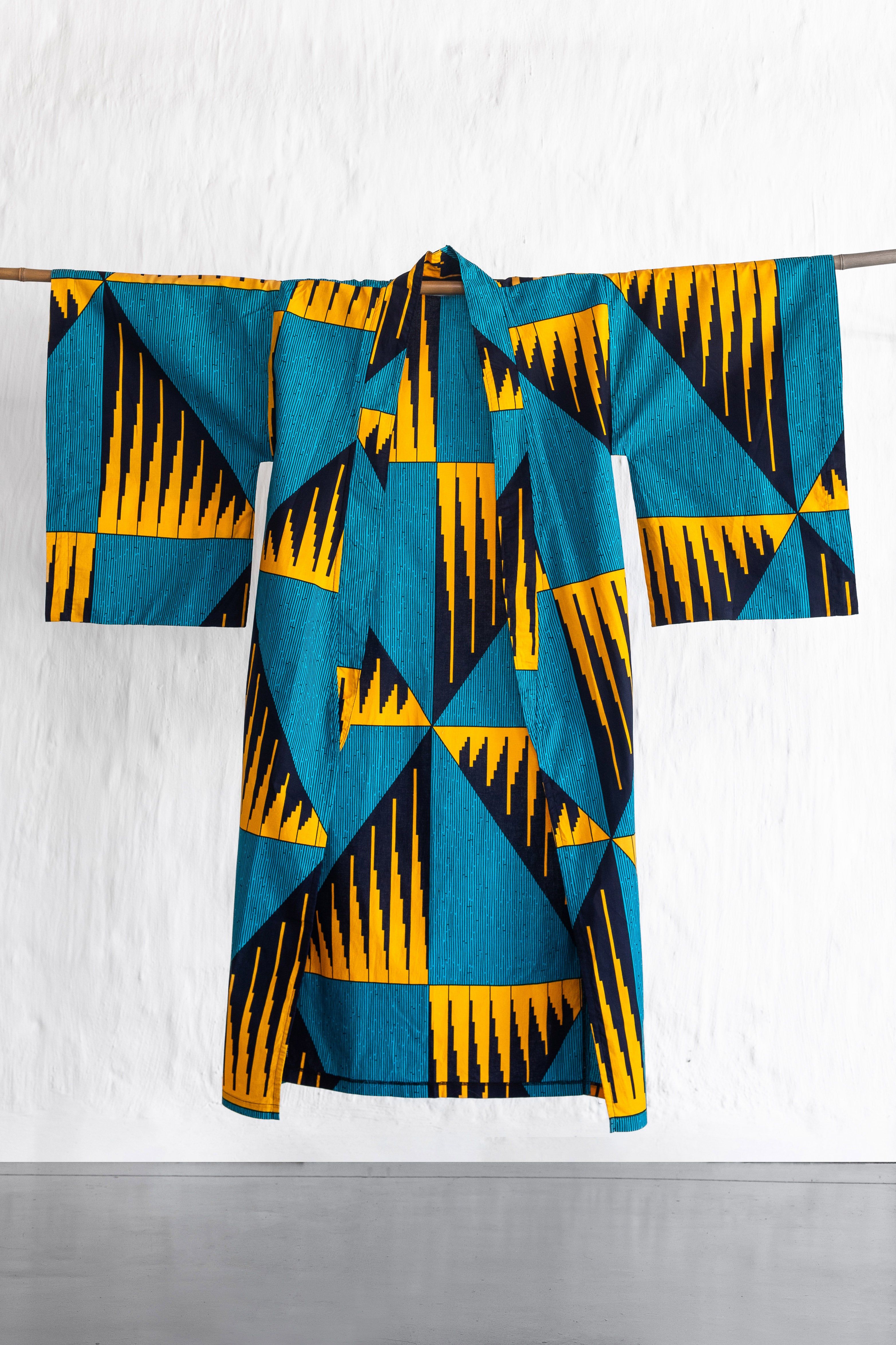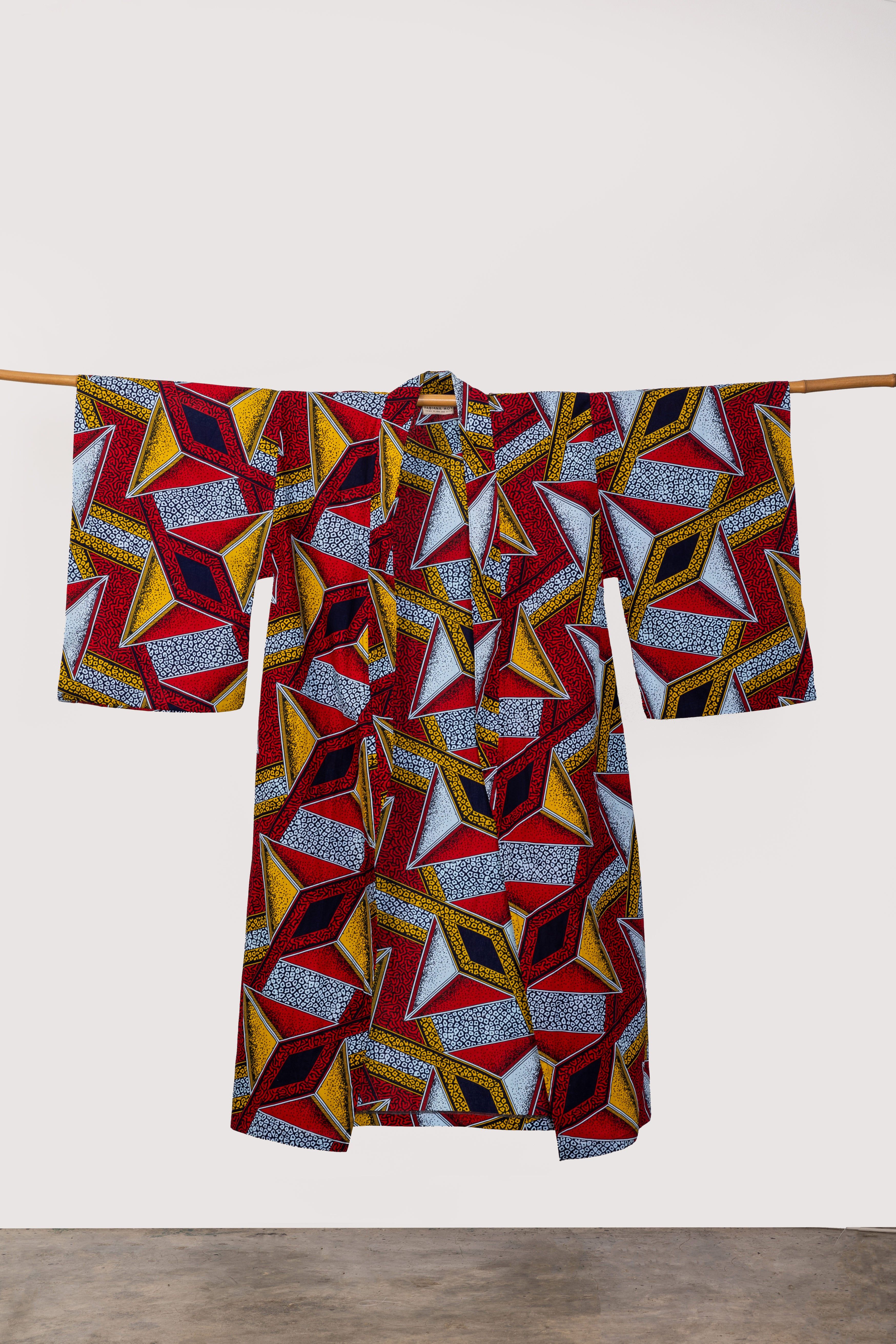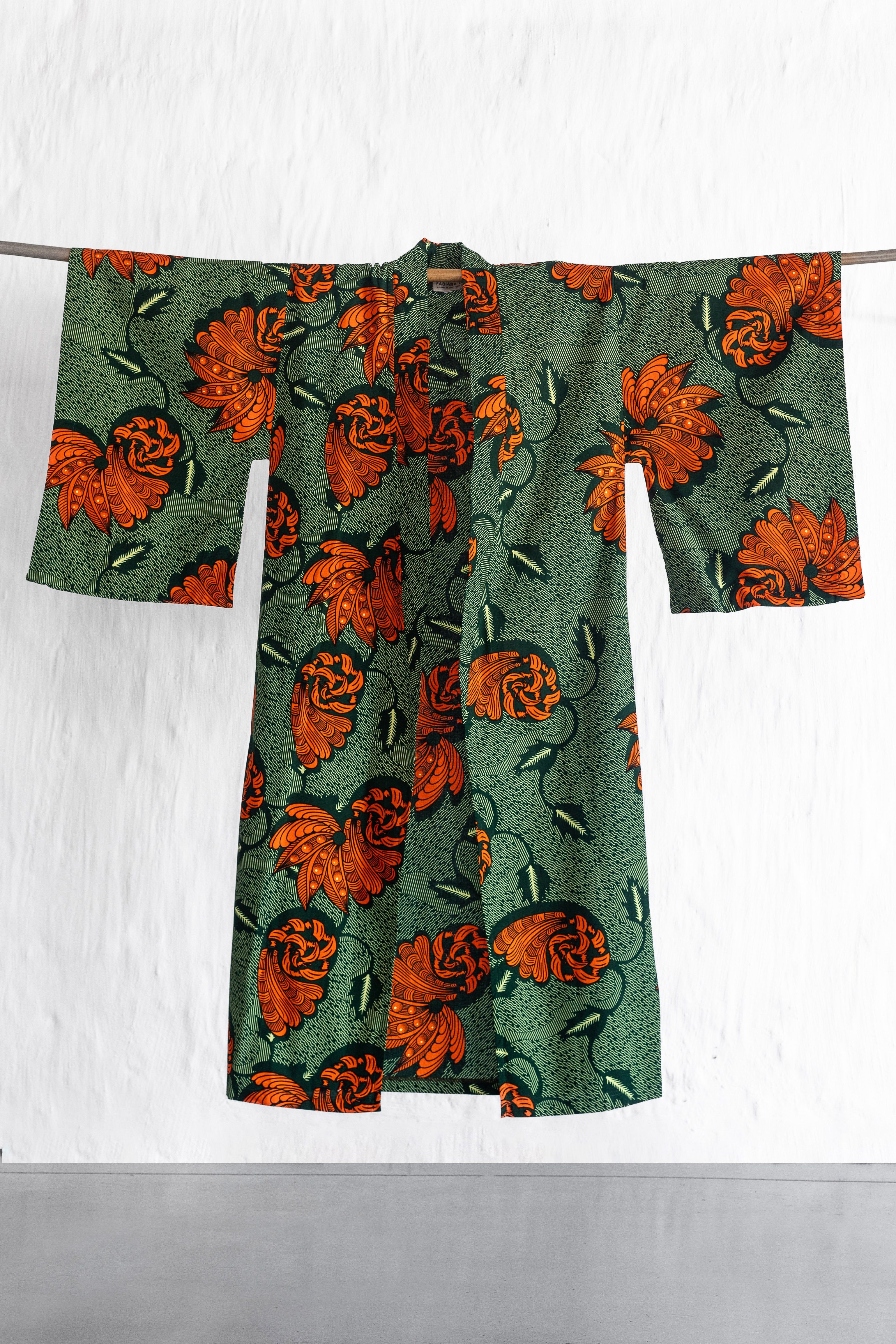 This versatile garment takes inspiration from the elegant lines of the traditional Japanese kimono, reimagined with the vibrancy of African fabrics.